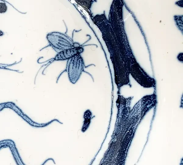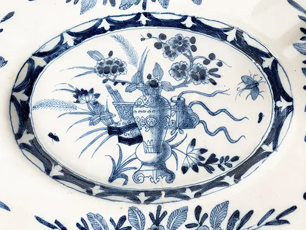 Questo soggetto decorativo, che trova illustri precedenti in molti esemplari cinesi e che fu interpretato anche dalle fabbriche di Delft e di Rouen, è conosciuto nell’arte cinese come “decoro delle cento antichità” (po-ku), definizione con cui s’indicavano cento oggetti dalla forte carica simbolica. Il vaso gu con un ramo di fiori è generalmente legato allo qi, l’energia vitale; il contenitore da cui fuoriescono i nastri rimanda agli antichi vasi cerimoniali che simboleggiano la pietà e il rispetto per gli antenati. Le pile di libri legati e i rotoli ricordano l’importanza dell’arte calligrafica, della scrittura e dello studio, attività di fondamentale importanza per il letterato.