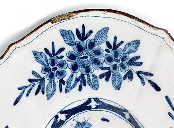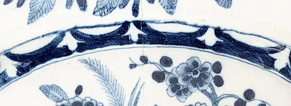 L’ornato, raffinatissimo, mostra, al centro del cavetto, una composizione con un alto vaso su piedistallo accompagnato da libri, rotoli, contenitori, nastri e fior di loto e una farfallina dalle fattezze occidentali e molto più prossima agli esemplari clericiani, che agli originali cinesi. Una fascia a giorno sulla balza introduce alla tesa ampia e mossa, a sua volta decorata con fiori di pesco a gruppi di tre, disposti nei punti cardinali.
