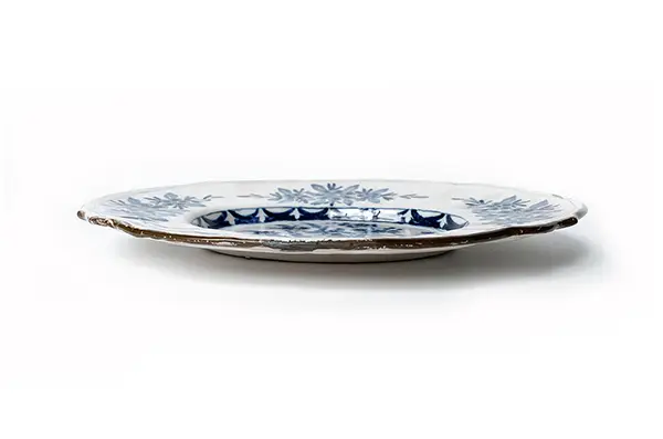 Il vassoio ha forma ovale e bordo mistilineo, è rivestito di smalto leggermente azzurrato e la decorazione, fatta eccezione per la sottile linea manganese sull’orlo, è realizzata interamente in blu di cobalto.