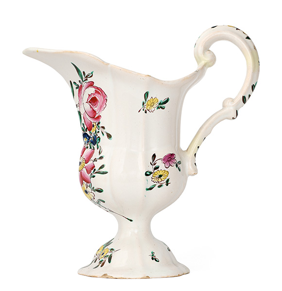 Poche sono le opere simili conosciute in collezioni pubbliche o private nelle quali il contenitore ha riscontro stilistico, ma non morfologico: si distingue per complessità della forma che ha confronti nel piede, ma non dell’ansa con un’opera simile in collezione privata di Lodi a conferma dell’utilizzo in manifattura di più stampi (F. Ferrari, La ceramica di Lodi, Lodi 2003, p. 276, n. 230). Più affine per morfologia del corpo e del piede un versatoio – sempre in collezione privata – che condivide con il nostro la scelta stilistica del fiore contornato realizzato con grande quantità di pigmenti, ma con il bouquet di fiori distribuito sui lati del corpo (S. Levy, Maioliche settecentesche lombarde e venete, Milano 1962, tav. 183).