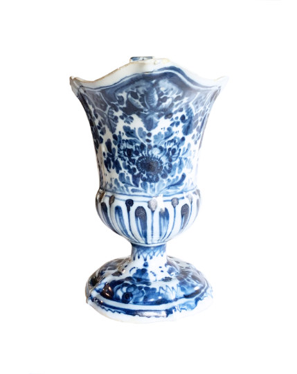 La superficie è ricoperta da uno spesso smalto bianco; la pittura è veloce, ma precisa e non lesina nell’uso del prezioso pigmento blu. Il decoro, interessa tutta la superficie, compreso l’orlo interno, e prevede sul fronte un fiore a larghi petali accompagnato da una decorazione fitoforme che si sviluppa radialmente con fitti rabeschi geometrici, secondo i dettami della cosiddetta decorazione “a merletto” che s’ispira alla coeva decorazione francese a lambrequins et rayonnants o alla Rouen. Il decoro s’interrompe nel calice, decorato a baccellature ovoidali, per poi riprendere con le medesime modalità alla Rouen anche sul piede.