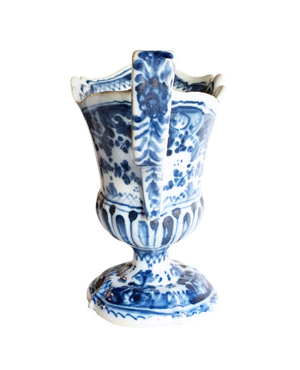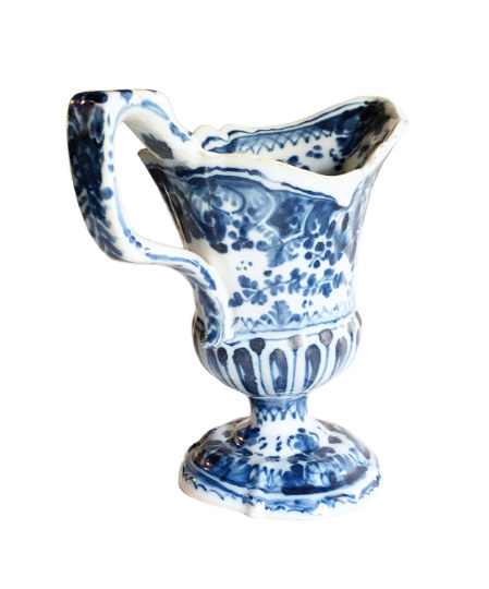 Il versatoio di maiolica ha un’imboccatura con lungo becco triangolare e orlo sagomato, appena estroflesso, che si alza nella parte posteriore dove s’innesta l’ansa. Quest’ultima è portata alta ed è costituita da un cordolo a sezione piana che, dall’innesto all’orlo, delinea scendendo una ”S” che termina con un lieve aggetto. L’invaso liscio e cilindrico si allarga alla base a formare un calice arrotondato, appena baccellato, per stringersi in uno stelo e allargarsi poi in un ampio piede costolato, sagomato, leggermente estroflesso e con base concava.